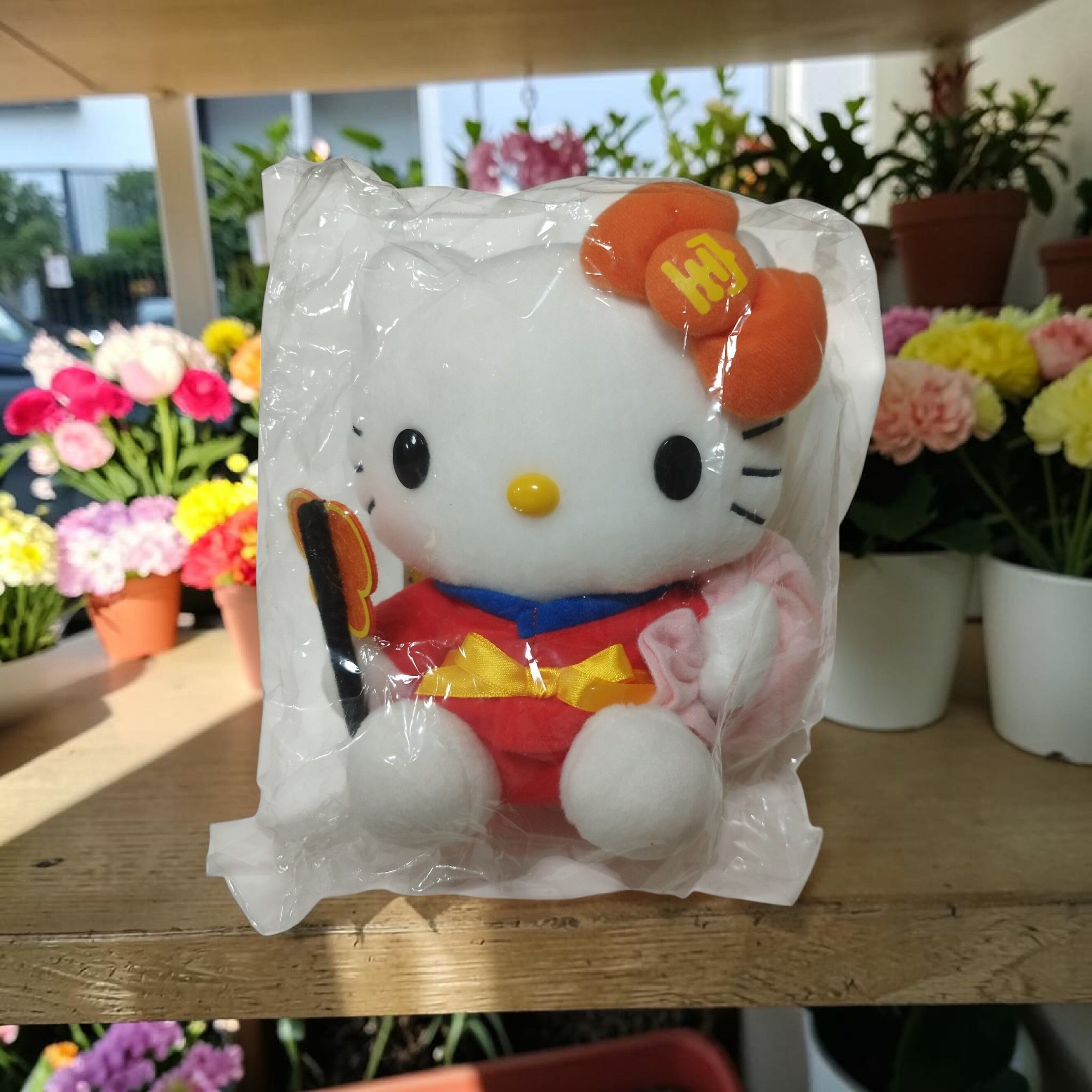 この特別な商品は、2016年の西銀座チャンスセンターでの特別企画として製作された300セット限定のオリジナルぬいぐるみの1体です。ハローキティが愛らしい布袋の姿に変身したデザインは、見る人の心を癒し、華やかな雰囲気を演出してくれます。柔らかい素材と親しみやすい表情が、どんな場所にもぴったりなアイテムです。