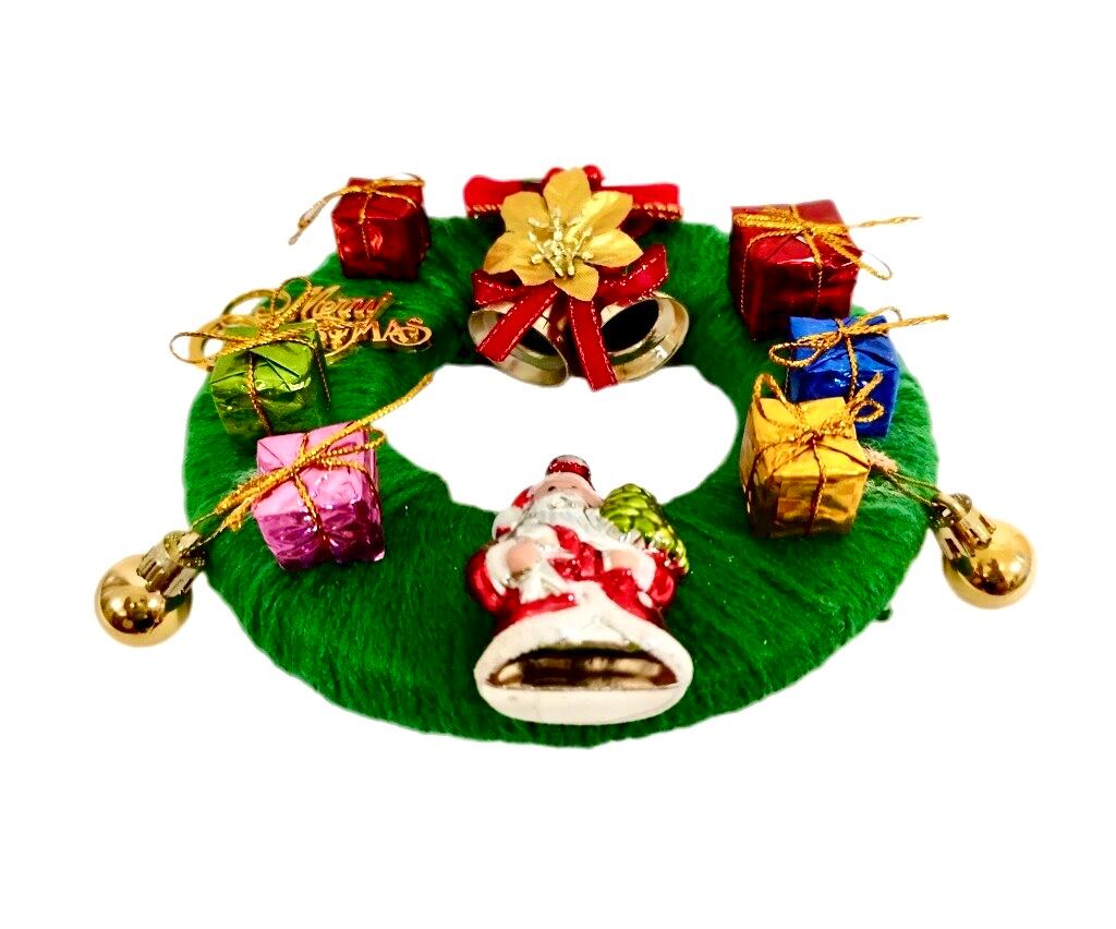 クリスマスリボン赤、ダブルベルゴールド、メリークリスマスロゴシート、プレゼントBOX大、プレゼントBOX小5個、サンタクロースオーナメント、クリスマスボールゴールド2個、壁掛フックがついた手作りのクリスマスリースです。