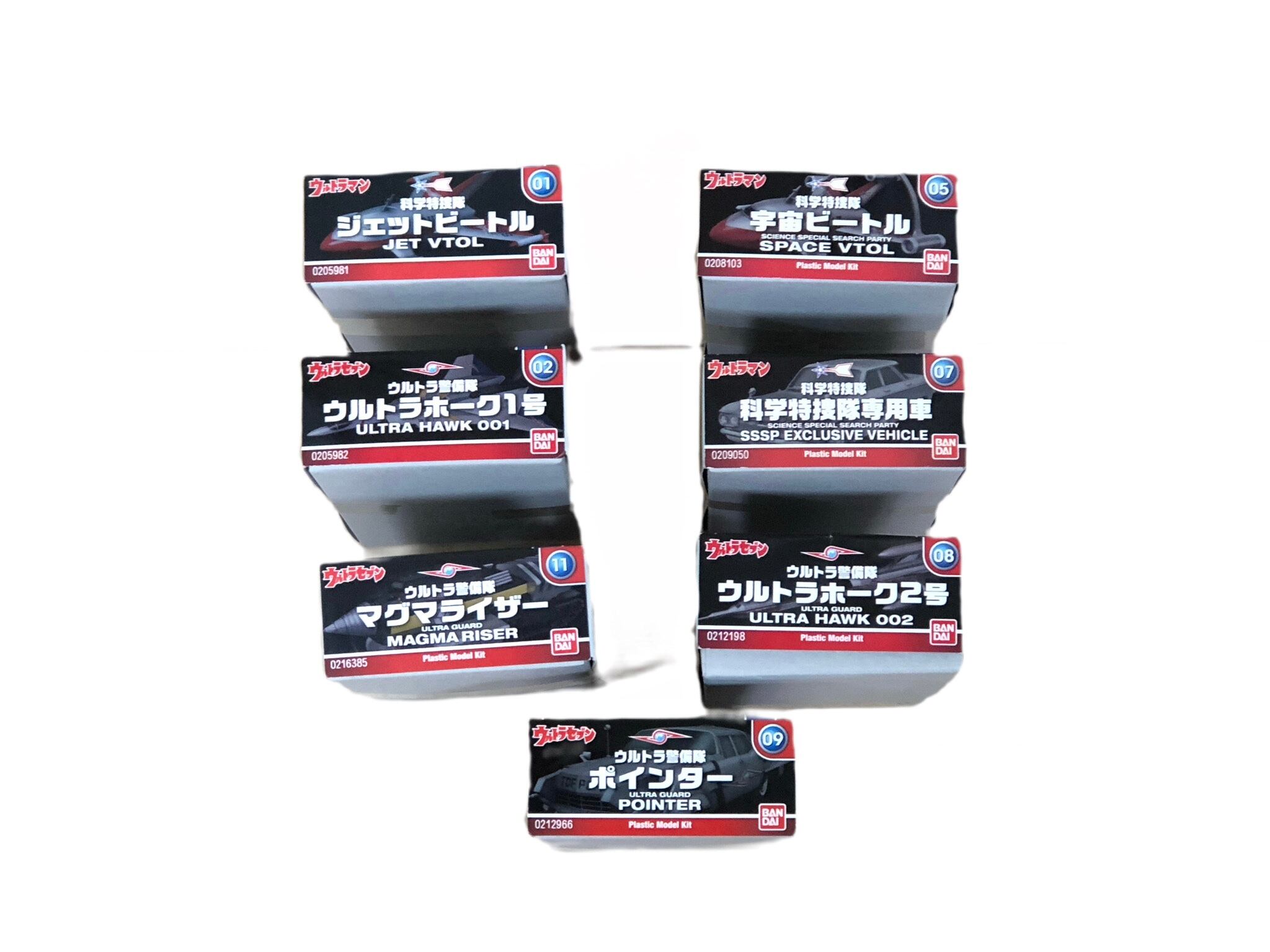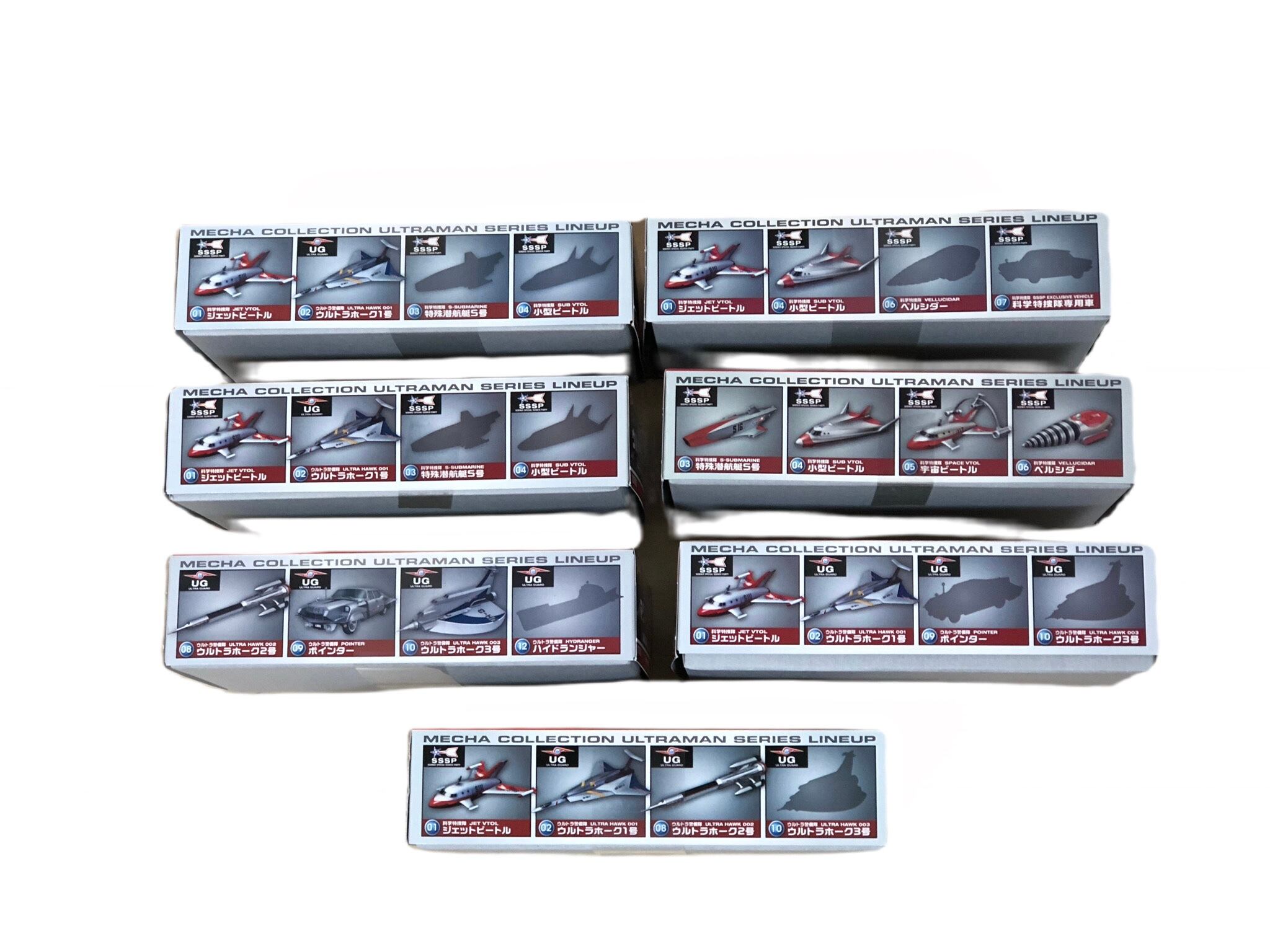 ウルトラマン&ウルトラセブンのメカコレクションになります。ジェットビートル、宇宙ビートル、ウルトラホーク1号、ウルトラホーク2号、科学特捜隊専用車、ポインター、マグマライザーの7種になります。