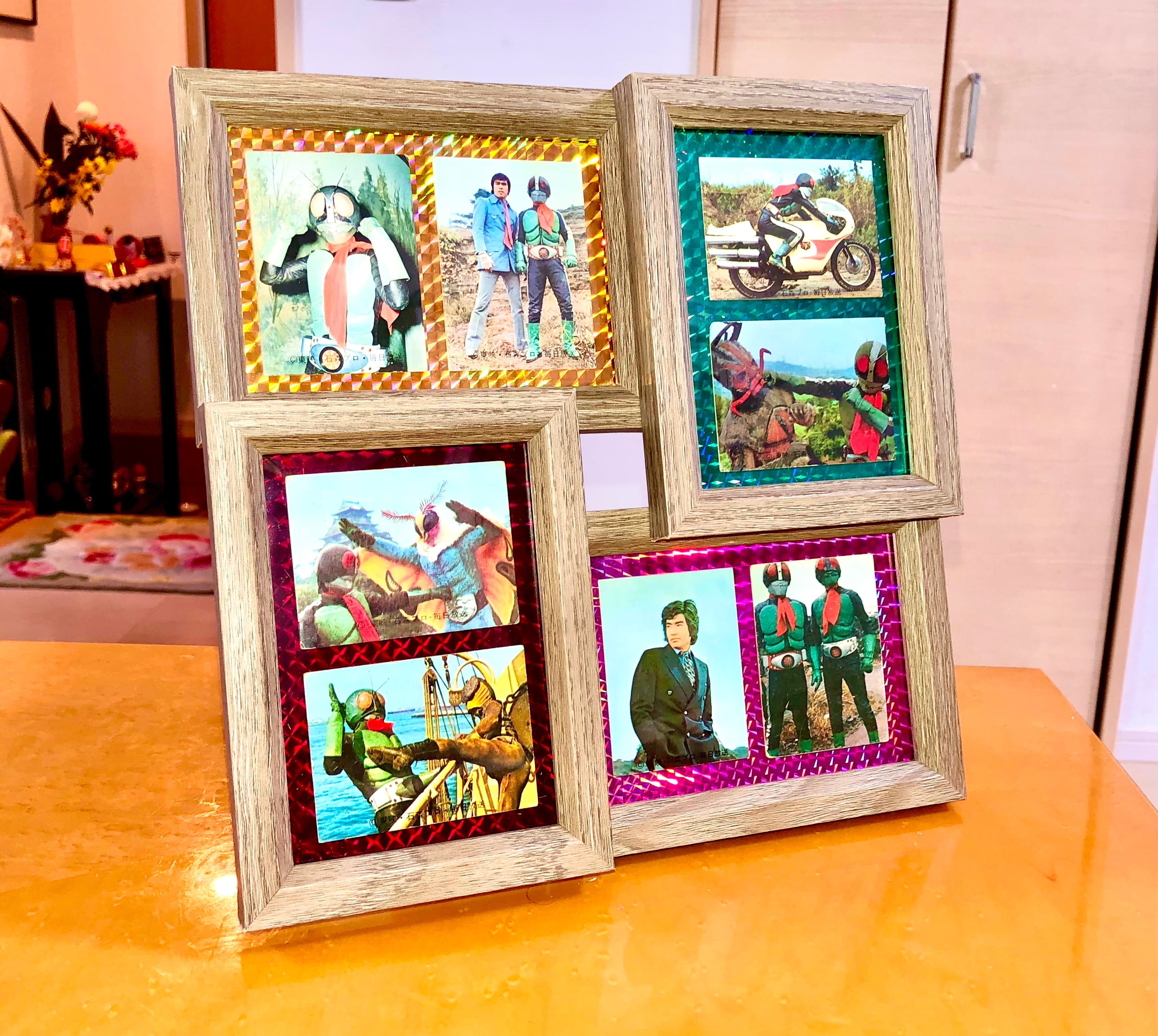 カルビーの仮面ライダーカード8枚を、額装しました。背景に、ホノグラムシートを付けてあります。