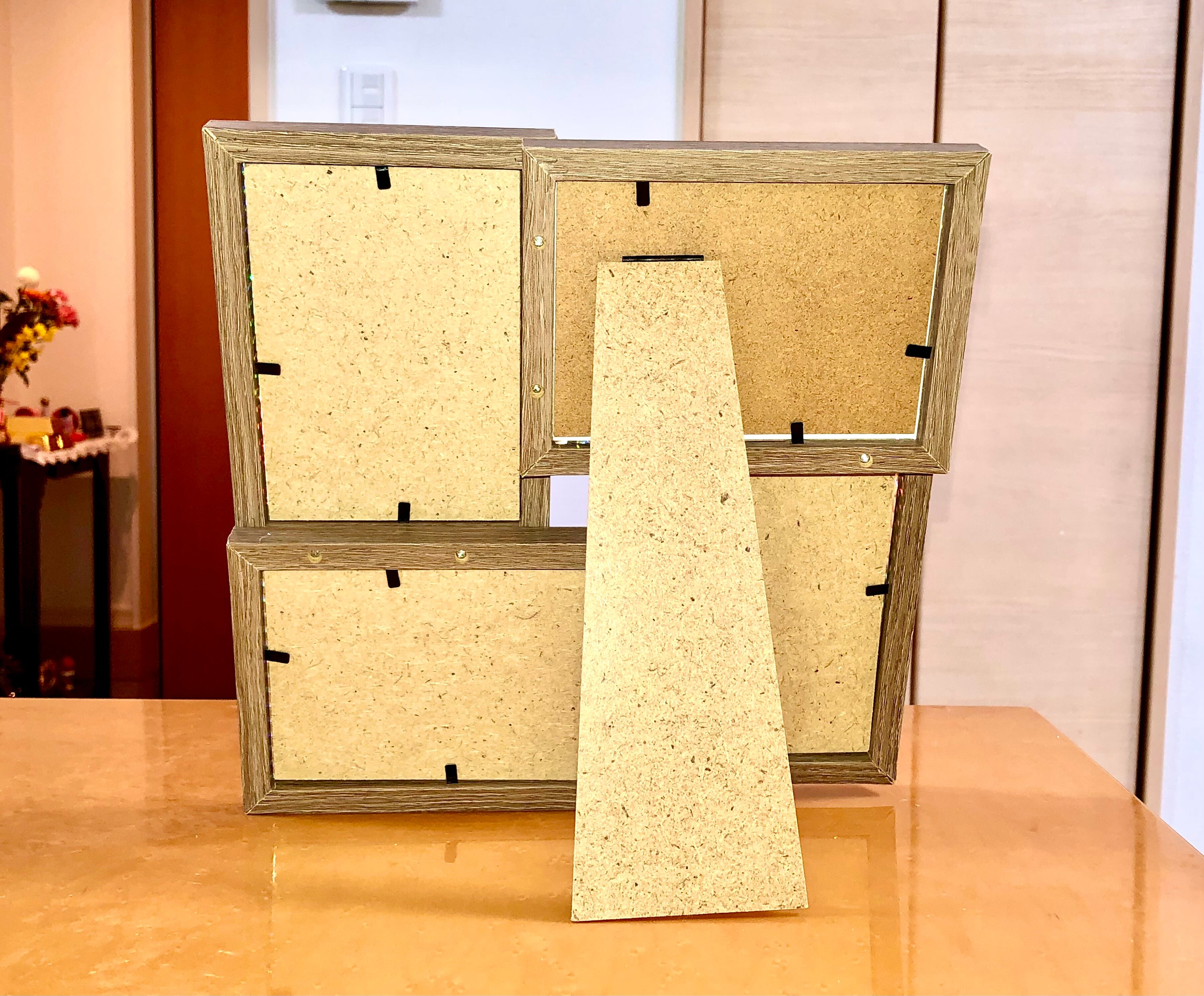 額は木製で、サイズは、縦約25.5cm×横約25.5cmの正方形です。衝立があり、立てられます。4つの額が固定されて、1つの額になっております。