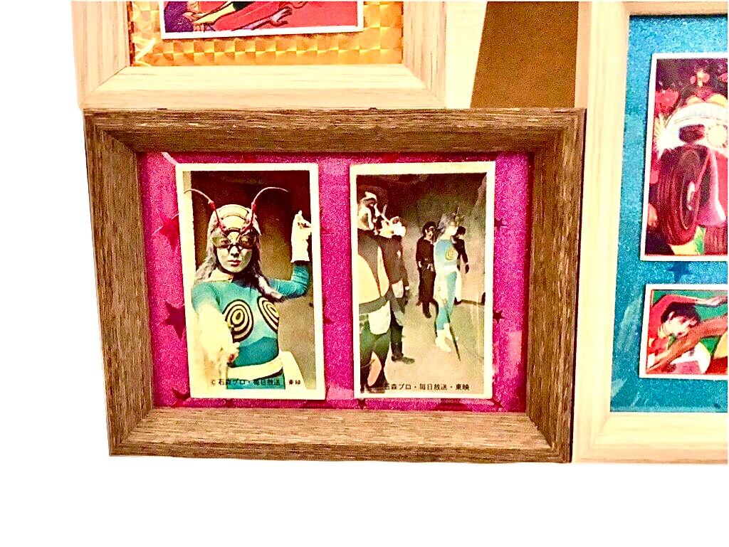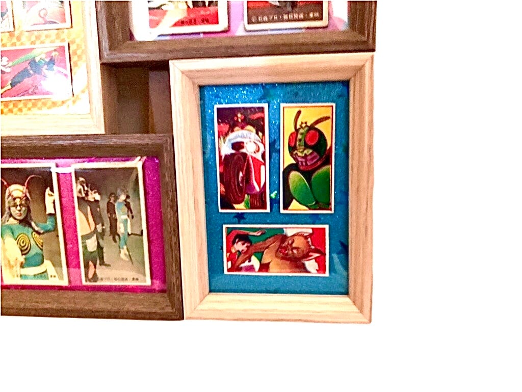 仮面ライダーのメンコを額装しました。漫画版と特撮版をミックスして、構成しました。