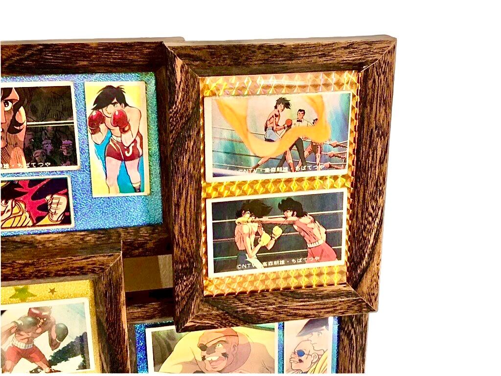 ジョーのメンコの額装は、ジョーの得意とするクロスカウンターのシーンもあり、ウルフ金串や、力石徹、丹下会長などの迫力ある絵柄のものを10枚選び、満載致しました。